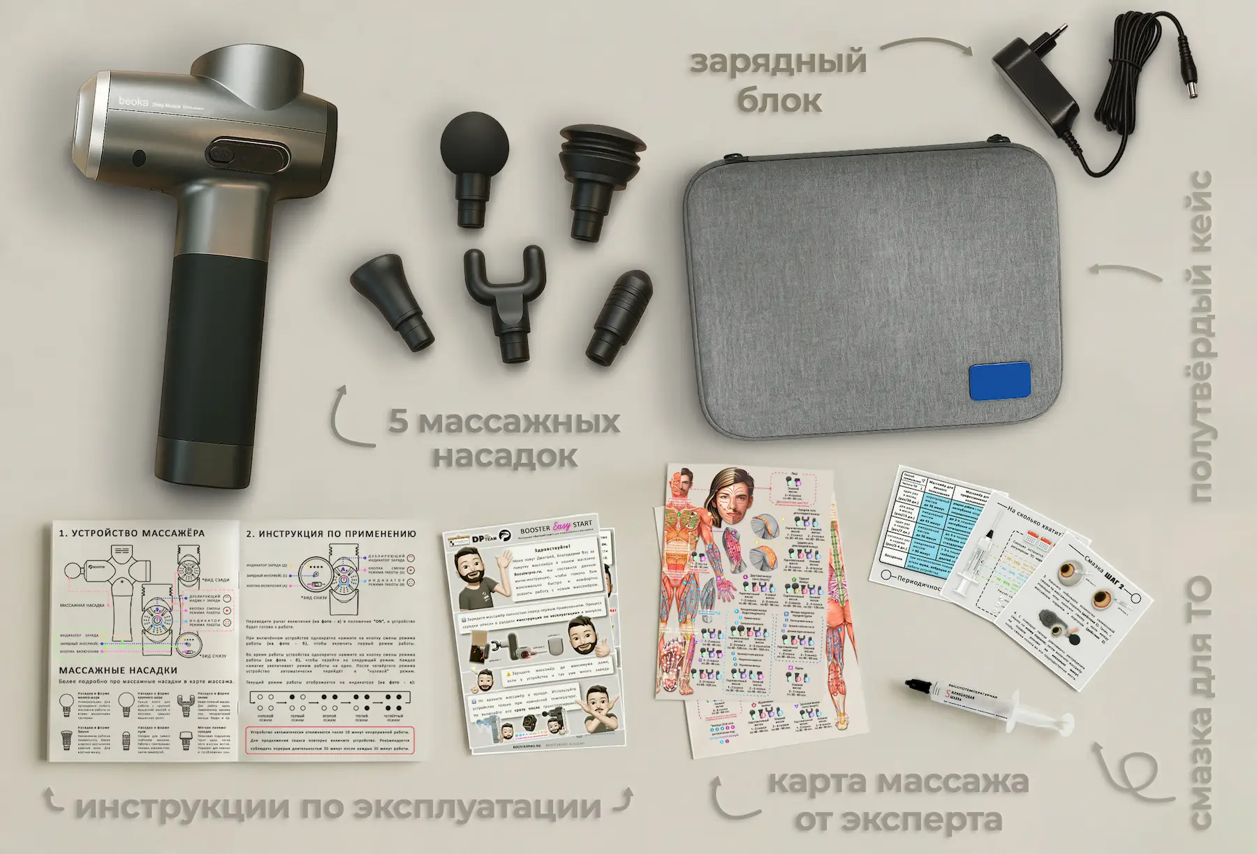 Среди них: инструкция по эксплуатации устройства, карта массажа с рекомендациями по времени, количеству сеаснов, выбору насадки и направлению движения массажёра, а также мини-инструкция с самыми важными моментами. Все документы на русском языке.